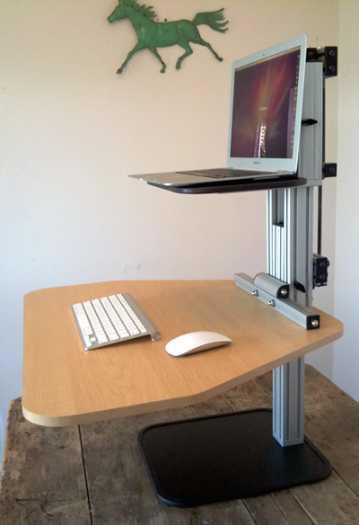 I won't say that it was easy making the transition to standing, my legs were killing me for weeks and I still get tired, but standing has becoming 2nd nature for me now, and with the proper workstation, I prefer it now. Working endlessly on the computer is no longer such a pain in the butt! Ergodesktop is a relatively small company and I found them very easy to work with. They reply quickly to questions and were open to my comments and suggestions on their products. If you are thinking of making the transition to Geekus Erectus, and want the versatility of a dual mode workstation, I'd highly recommend you check out their products. Standing tall... The Kangaroo holding a MacBook Air , Apple wireless keyboad and Magic Mouse. |