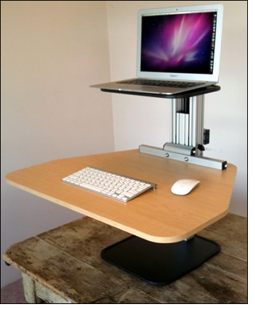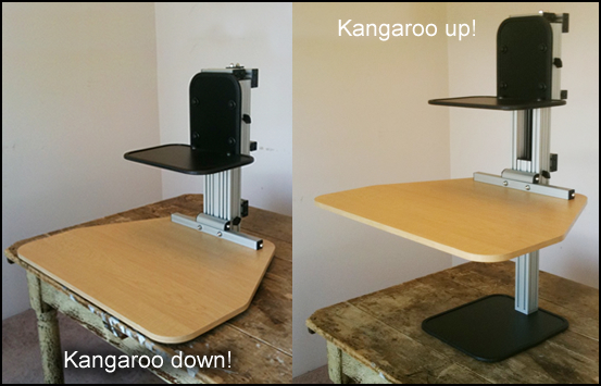Now if you are starting out on this great standing adventure, the first thing you are going to have to do is adjust your workstation to suit. You have a few choices with that... raise your monitor and keyboard, raise your current desk, buy a new desk with a higher surface made specifically for working while standing, or dig a hole in the floor that you can stand in. I'll leave the hole digging for another day.I struggled with how to make my work area usable and ergonomic. I started off by raising my monitor and keyboard by putting them on boxes of various heights. OK, that didn't last long. It was precarious at best and really annoying when I wanted to switch back to a sitting position. A Google search for standing desks revealed several products, but they were all fairly expensive and I wasn't sure if I was ready to make such a commitment to standing. So my problem was how do I start standing, yet still be able to use my current desk and chair? This is where the products of Ergodesktop fill a unique niche. Their workstations sit on your existing desk and allow you to alternate between standing and sitting throughout your work day. This is a huge advantage, especially when you are just starting out with standing, and need to switch back and forth to give your newbie legs a break. They are also the perfect way to bring this functionality to your office or cubicle if you don't want or can't change your entire desk. Ergodesktop sells four products, the Wallably, an adjustable-height stand up desk unit with a main platform, and three versions of the Kangaroo, which offer the main platform plus increasingly more sophisticated ways to hold your monitor. The Kangaroo offers a simple shelf with height adjustment to hold your monitor, while the higher end models like the Kangaroo Pro and Kangaroo Elite feature VESA mounts to secure your monitor or dual monitors, and add the benefits of the monitors being fully adjustable, including pan, tilt, and portrait to landscape. I jumped at the chance to review a Kangaroo. It's designed to hold your keyboard and mouse on the work surface and hold either a LCD monitor or a laptop on the adjustable monitor shelf, at an ergonomic height. The main platform is adjustable vertically 15" and the monitor shelf is separately adjustable an additional 6.5". The Kangaroo's platform is very stable, and allows you to work comfortably on it: type on your keyboard, write notes on a pad of paper, and hold your coffee. Now you are not going to be able to climb up and bounce up and down on the platform, but your cat probably will. The maximum LCD monitor size for this model is 21", with a maximum weight of 12 Lbs, which makes it probably too small for older and heavier CRT monitors, but is fine for a laptop or contemporary LCD or LED screens. If you have a heavier monitor like an Apple Cinema Display or an iMac, Ergodesktop does offer Kustom Kangaroos where they will increase the carrying capacity of the stand with the appropriate nitrogen springs for an additional charge ($85.00). If you think your monitor might be too heavy, or have any questions at all, just email or call them.