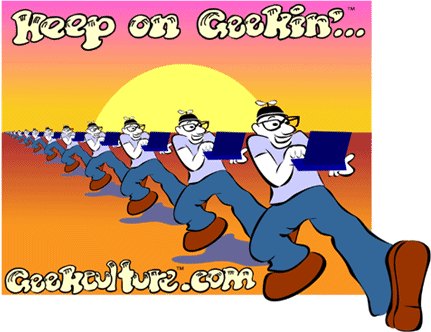 It's the one, the only, the original Keep on Geekin' t-shirt from Geek Culture! You know how cool this image is... Geeks to Infinity, geeking out! Now you can wear and share that joy by getting the t-shirt! ;-) Check it out in our CafePress store! |