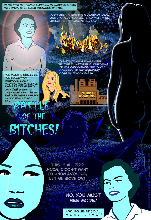 | Bambi in the Void! On the edge of death, Bambi receives a visit from one of the First Four! Revealing herself to be a Mistress of Time, she proceeds to show Bambi the future.... a future without Bambi! A mind boggling, time twisting, comic-shaking episode, featuring the lovely and diabolical Sys Admin, and return of Lord Stewart (and boy, does she looks pissed!). A rich print of the comic, with Martha's silhouette ominously emerging from the deep dark blues. 11x17 inch poster sized print... only 9.95! |
