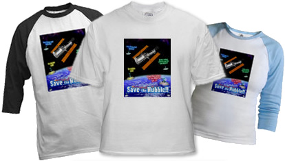 ![]() Save the Hubble!It doesn't take a powerful lens to see that the Hubble Space Telescope is something worth saving. With certain parties in NASA threatening to shut down the Hubble before it's time, we need to get the word out to Save the Hubble! Show how you feel with one of our great tees, caps, posters, stickers mugs, and more. Available in two awesome designs: our original comic, and also a simplier design without the alien protesters. Both are gorgeous illustrations by Nitrozac. Let's hope if enough of us spread the word, the Hubble can keep on looking into the past, for a long time in the future! |