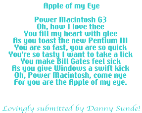 as cute as a puppy, as warm as a toaster, my little grey imac, she gives me her moster. from optical mouse to her transparent keyboard from translucent siding to sea-green A/C cord. she runs OS ten and 9.1 natively and apps from adobe make me creatively. i watch DVD's in letterboxed stereo and burn all the MP3's i can carry-o. she's ethernet ready and legacy-free with firewire ports and of course, USB. they call me obsessive, they call me a geek. they tell me "get out more" and cringe when i speak, but the truth's clear to me and it's something i get some lovers are carbon, and some carbonate. david r. macgeek laureate |