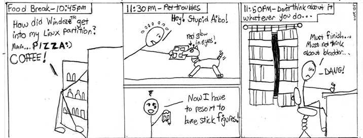 16. red glow in Aibo's eyes: reference to the Terminator, of which Arnold Schwarzzenager(sp?) is a star. Arnie is buff just like Linus Torvalds' shower scene in AY2K.
