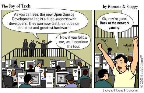 Welcome to the Joy of Tech... illustrated by Nitrozac and written by Nitrozac and Snaggy. It's a little bit simpler in style than our other comic After Y2K, and will be more topical. We hope you'll enjoy it!
