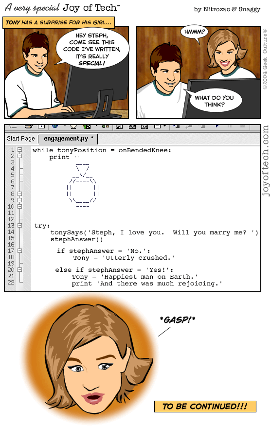 HomeGeek Culture... Geek Love, Geek Files, Mind Numbing Magazine, all kinds of geeky stuff!The Webstore! Get some cool stuff, and support your fave comic creators!e-Cards!The ForumsThe Joy of Tech! ...your quick fix of comic fun!After Y2K!webcam!