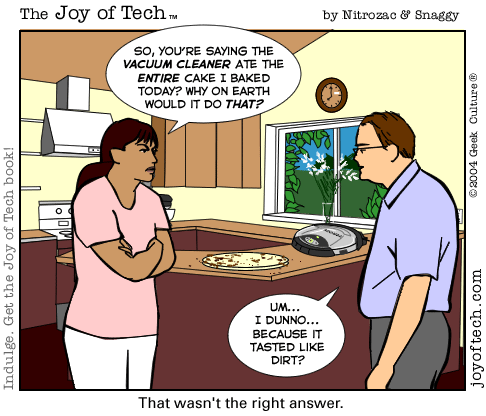 - "I don't know why the vacuum cleaner ate the whole cake, it knocked me out first."