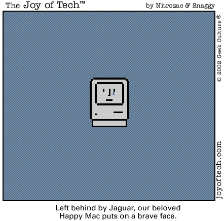 If you're using a Mac and a newer version of Explorer, here's a neat trick courtesy of MacMerc. Drag the above little image to the top tool bar of your browser, it should "stick" afterwards. Now you have a graphical link to the Joy of Tech, one that will update everytime a new comic is uploaded. If you need to delete or move it it, just Command/drag it around, or to the trash.