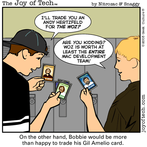 If you're using a Mac and a newer version of Explorer, here's a neat trick courtesy of MacMerc. Drag the above little image to the top tool bar of your browser, it should "stick" afterwards. Now you have a graphical link to the Joy of Tech, one that will update everytime a new comic is uploaded. (You may have to refresh the image manually if it's in your cache.) If you need to delete or move it it, just control button/click and hold, then select delete, or just Command/drag it to the trash.