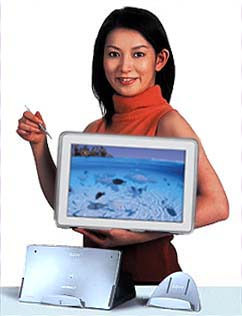 There are 3 components, base station, monitor and cradle. The monitor contains batteries which are recharged from base station or cradle. The base station has modem, TV antenna, video input, USB and ethernet connections, and communicates with the monitor by wireless (IEE802.11b). The monitor contains speakers, headphone jack, a 12-inch touch screen and memory stick. It runs its own OS and proprietary software including web browser, e-mail and photo album.