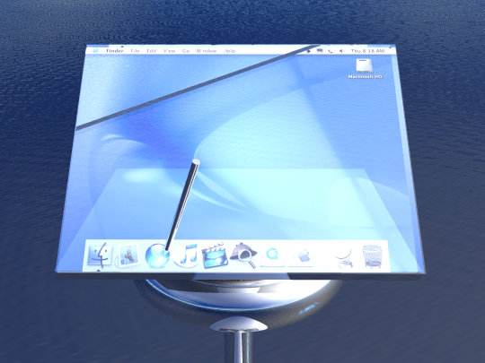 The agMac doesn't have an LCD monitor, it uses a projector to show images. The projector also includes a built-in touch screen and handwriting recognition, so we've done away with the mouse and keyboard, in favour of a stylus. How they managed to do that is beyond me the details of the project are so secret that only engineers directly associated with it can access them.