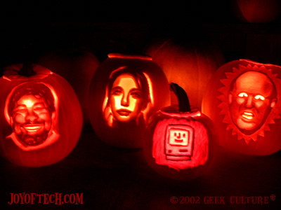What would Halloween be without Jack O'Lanterns... with a Joy of Tech twist! We decided to do some pumpkin carving this year, so after Nitrozac did some research on the web, we applied that knowledge to some suitable pumpkin specimens!