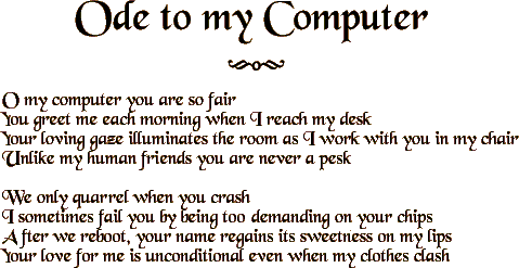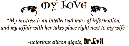 The Society for the Scientific Investigation of Carbon/Silicon Bonding presents: I admit it, I love my computer: We are currently studying the phenomena of Human/Computer Love, that is, the intense bonding that occurs between geek and machine. As part of this research, we present a number of creative works relating to this issue. It is our hope that these tributes will inspire others to publicly reveal their true feelings for electrical circuitry, and perhaps begin the road to understanding. |