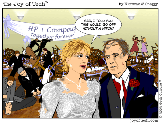 Like our work? Want to make a guest appearance in a comic? Help us keep the laughs coming by becoming a SuperFan! ![]() Mac Genius t-shirts! ![]() The TTB t-shirt! NOW IN STOCK! ![]() Beanies! Relevancy Link: HP's Fiorina on Merger: We Win |