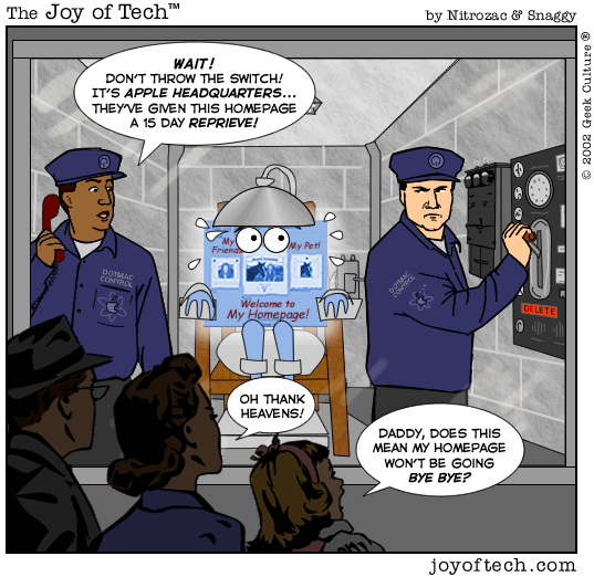 If you're using a Mac and a newer version of Explorer, here's a neat trick courtesy of MacMerc. Drag the above little image to the top tool bar of your browser, it should "stick" afterwards. Now you have a graphical link to the Joy of Tech, one that will update everytime a new comic is uploaded. (You may have to refresh the image manually if it's in your cache.) If you need to delete or move it it, just control button/click and hold, then select delete, or just Command/drag it to the trash.