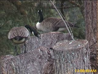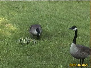 | The Canada Geese that were nesting in the tree had their family hatch! In a very interesting event, a number of geese came over to check out the new chicks. At first we thought it was an attack, there was quite a commotion and lots of honking. It seemed like at least two of the geese were protecting the mother, standing as guards right up there on the nest, while the dad was down below keeping others away. |
